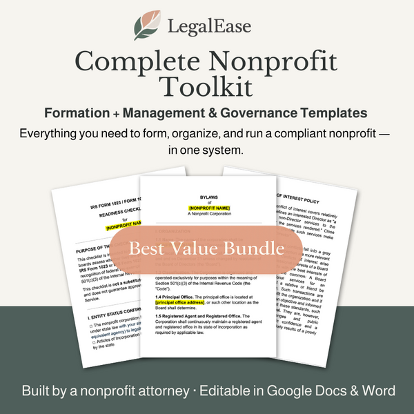 Everything you need to form, organize, and run a compliant nonprofit — in one attorney-drafted toolkit.